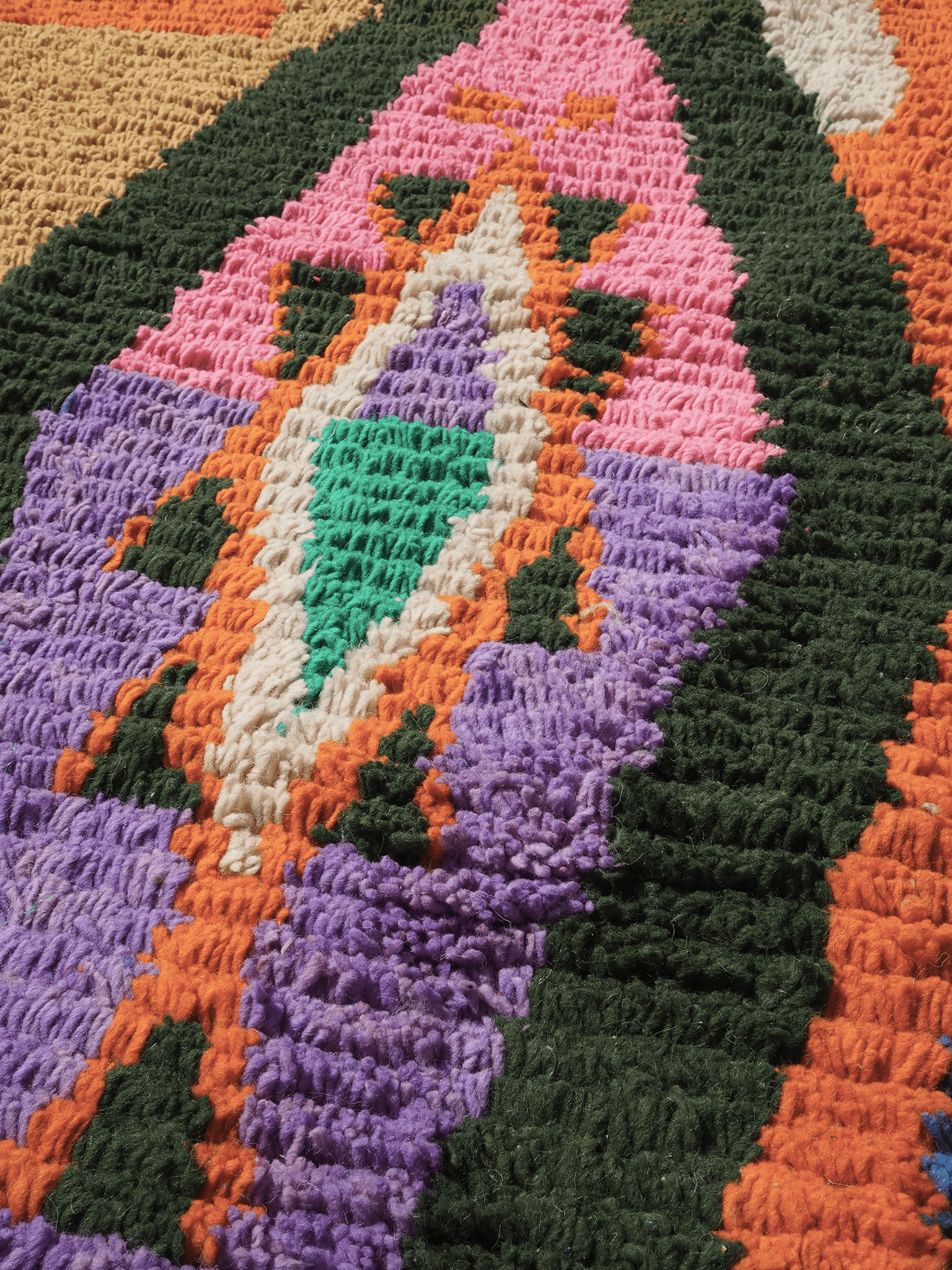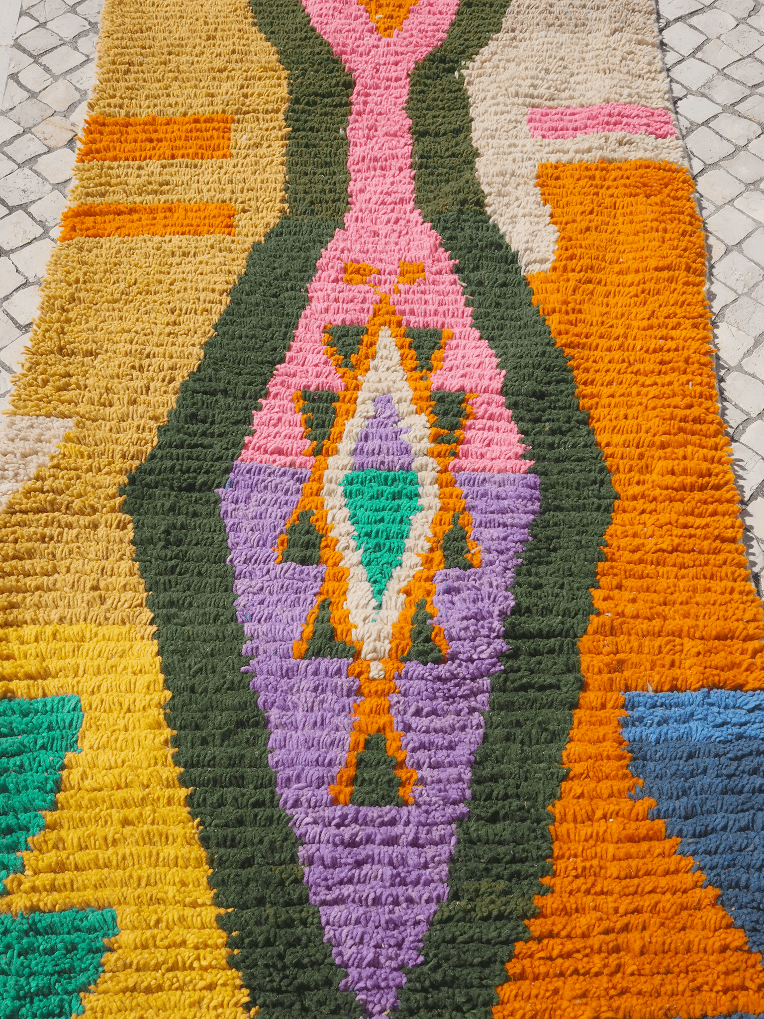 Rugs are laid flat to dry under the Moroccan sun, which naturally brightens the wool and enhances the rug's appearance.